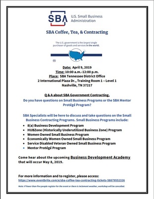 SBA Specialists will be here to discuss and take questions on the Small Business Contracting Programs. Small Business Programs include: